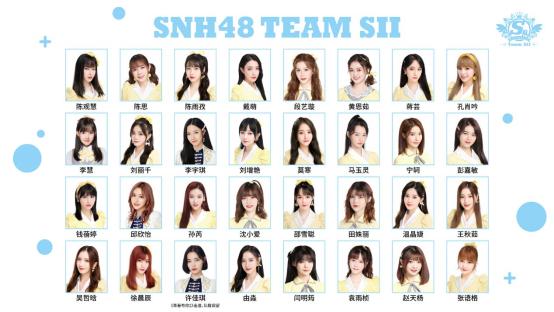 SNH48 TEAM SII:陈观慧、陈思、陈雨孜、戴萌、段艺璇、黄恩茹、蒋芸、孔肖吟、刘丽千、李慧、李宇琪、刘增艳、马玉灵、莫寒、宁轲、彭嘉敏、钱蓓婷、邱欣怡、邵雪聪、孙芮、沈小爱、田姝丽、王秋茹、温晶婕、吴哲晗、徐晨辰、许佳琪(《青春有你2》出道,队籍保留)、闫明筠、由淼、袁雨桢、赵天杨、张语格