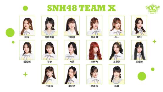 SNH48 TEAM X:陈琳、何阳青青、李星羽、李钊、刘胜男、吕一、潘璐瑶、祁静、冉蔚、宋昕冉、王菲妍、王睿琦、王晓佳、谢天依、杨冰怡、杨晔