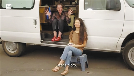 威尼斯电影颁奖礼现场播放了一段赵婷与弗兰西斯·麦克多蒙德共同录制的领奖视频。两人坐在一辆小货车旁,麦克多蒙德说道:“很明显我们不在威尼斯啦,我们在帕萨迪那(美国加州)的Rose Bowl!”该片近日在当地举办了汽车露天放映。两人各自感谢了影片的公司、团队、亲友,最后朝镜头微笑高呼:“我们路上见!”(胡广欣)