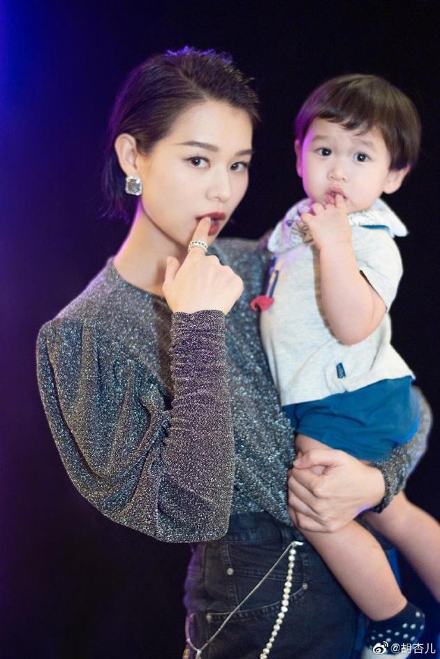 10月22日,胡杏儿晒出和小儿子的合影,并直呼“能带着你一起工作,妈妈太幸福了!”照片中,胡杏儿妆容精致,单手抱儿子,模仿儿子做出相同的动作,温馨可爱。