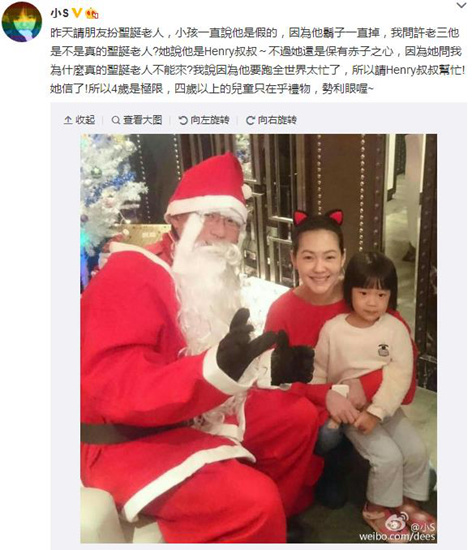 小S在微博晒出带女儿庆祝平安夜的照片,并感慨写道:昨天请朋友扮圣诞老人,小孩一直说他是假的。