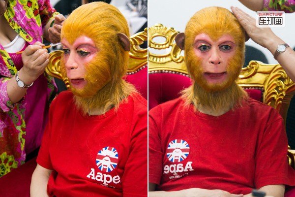 美猴王妆容化起来既繁琐,又耗费时间,要经历贴金眼皮、粘胡子、戴面具、整理等各种步骤。六小龄童显然对这些已经习惯。他端坐着,任由化妆师摆弄。六小龄童,本名章金莱,1959年4月12日生于中国上海。六小龄童家被尊称为猴王世家,六小龄童六岁从父六龄童练艺学武。1976年6月在上海高中毕业后,考入浙江昆剧团艺校,专攻武生。1982年初,六小龄童在二十五集大型神话电视连续剧《西游记》中主演孙悟空一角,父亲为他起艺名“六小龄童”,成为章家猴戏的唯一传承人。《西游记》在国内外播出后引起巨大关注,六小龄童也凭借这一角色创造出中国“美猴王”的经典。