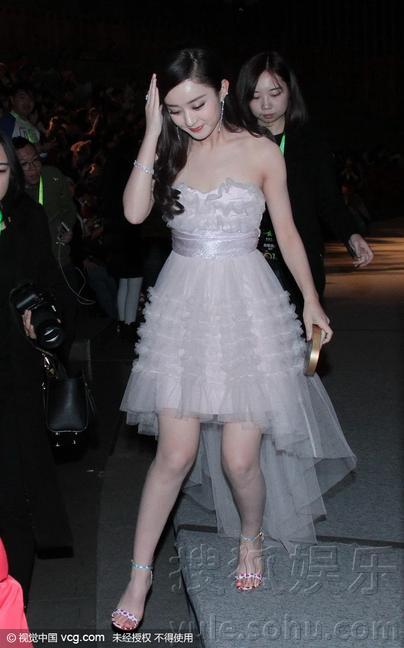 赵丽颖低胸纱裙现身 遮披肩御寒对镜头甜笑