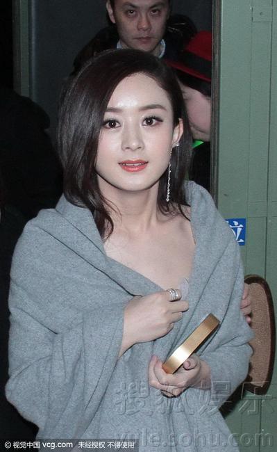 赵丽颖低胸纱裙现身 遮披肩御寒对镜头甜笑