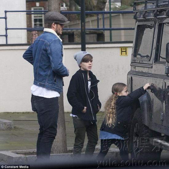 贝克汉姆带萌娃出街 小七长发及腰呆萌可爱