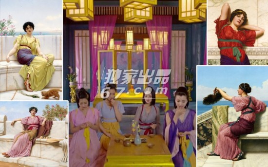 据说这宫中四个嗑瓜子的妃子服装设计参考了英国维多利亚时代的新古典画家约翰·威廉·格维得的油画作品,因太子妃升职记开机时间是浙江象山影视基地最炎热的季节,考虑到演员的身体状况,所以在设计时以飘逸凉爽为前提。不过小编眼拙,只看出了“暴露”俩字。