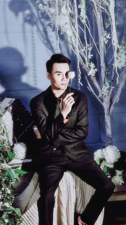 王凯一身西装绅士儒雅,手拿红玫瑰白玫瑰。
