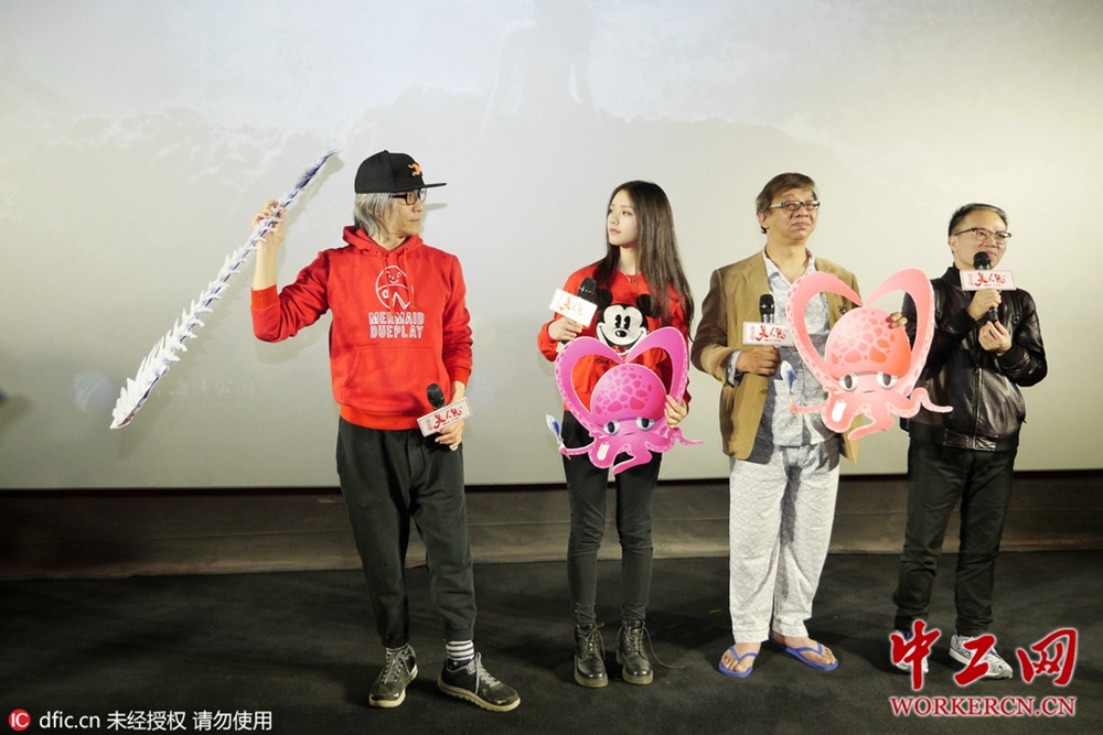 周星驰携电影《美人鱼》主创人员“美人鱼”林允、“博物馆馆长”杨能和“郑总”郑冀峰来到福州各大影城,在春节长假最后一天为影迷派送新年红包。