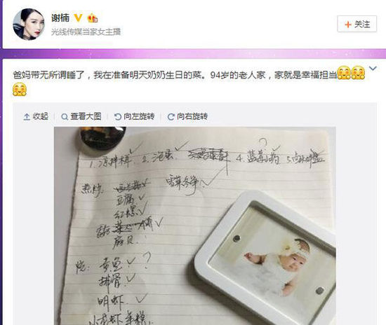 细心的网友算了一下,谢楠的手写菜单上有4凉6热,外加4种烧菜1份鸡汤,主食饺子,荤素搭配,考虑周全。谢楠更贴心写上备注,提醒自己哪些菜要先蒸熟,哪些菜是奶奶可以吃的,安排有度,简直就是里里外外一把抓的主厨担当。十几个菜中,谢楠细心圈出9个奶奶可以吃的菜,孝顺体贴溢于言表。谢楠用来压菜单的是相框中有一个头戴花朵的宝宝照片,被眼尖的网友认出是谢楠和吴京的儿子吴所谓,谢楠为家人的幸福感而努力的贤惠形象打动众人。