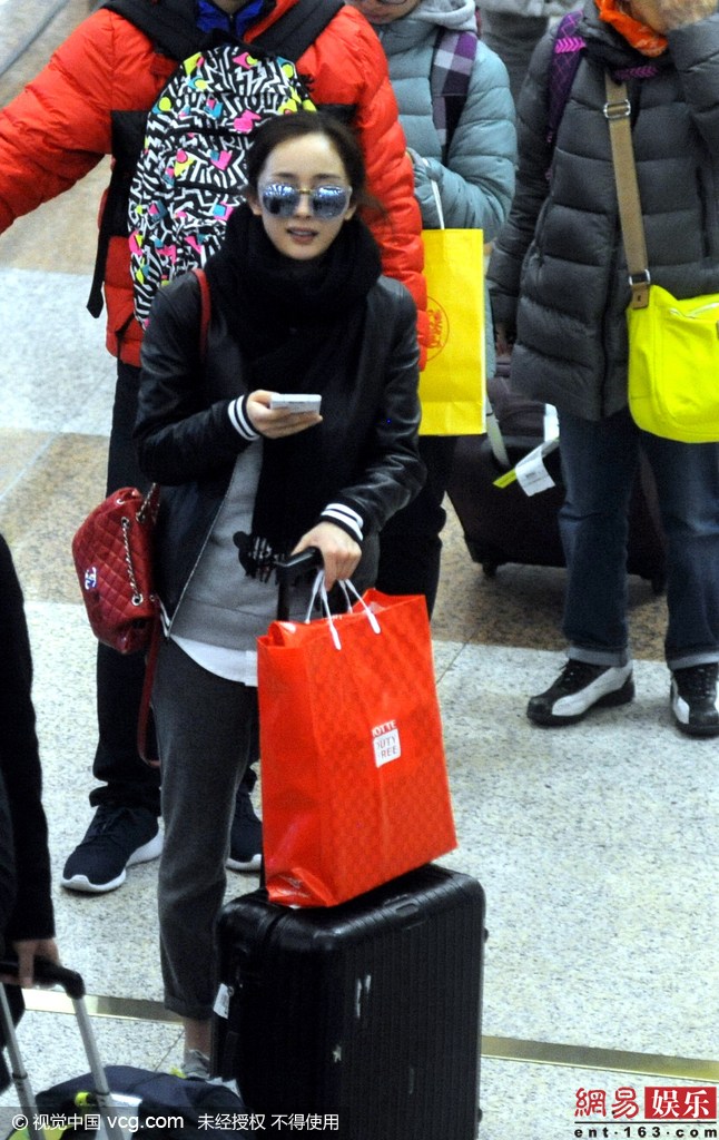 杨幂现身机场对镜头挥手 卡通卫衣套黑色棒球衣(组图)