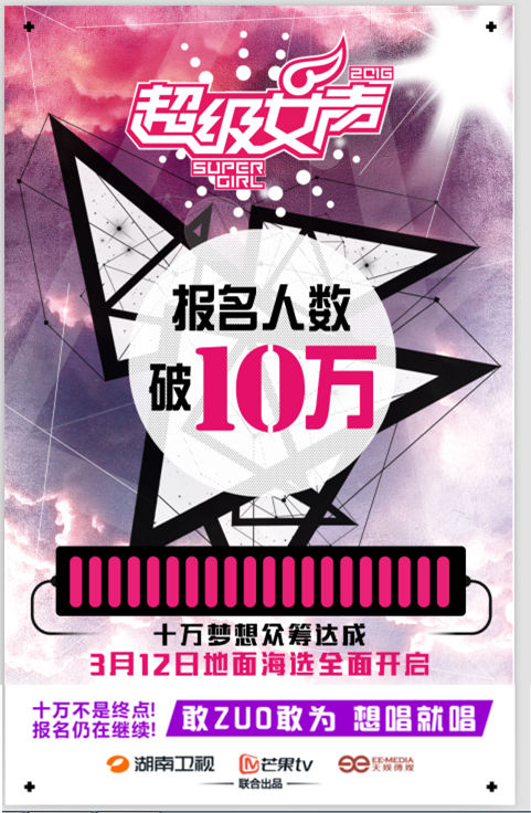 此外,在3月7日举行的发布会上,还将公布《2016超级女声》的赛制赛程、嘉宾导师等关键信息!“十万梦想众筹”的圆满达成只是一个开始,长达8个月的“超女风暴”将为网友和粉丝们献上一台饕餮的视听盛宴!