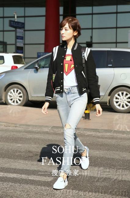 古力娜扎棒球外套配破洞牛仔裤,简单干练。
