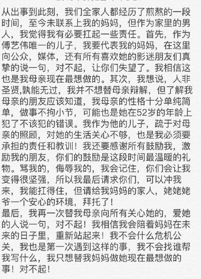 3月2日,演员傅艺伟因涉嫌容留他人吸毒被朝阳群众举报,被警方带走。当日晚,傅艺伟儿子高乐男发文替母亲向公众道歉,高乐男称:“作为傅艺伟唯一的儿子,我要代表我的妈妈,在这里向公众,媒体,还有所有喜欢她的影迷朋友们真挚的说一句,对不起,让你们失望了。”高乐男还称自己至今为联系上自己的妈妈,还称自己对母亲关心不够,自己必须要承担责任和教训,并请求大家不要打扰自己的家人。