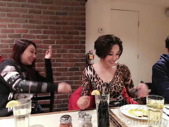 61岁刘晓庆纽约用餐 着豹纹低胸衣性感迷人