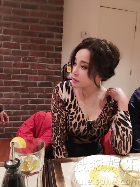 61岁刘晓庆纽约用餐 着豹纹低胸衣性感迷人