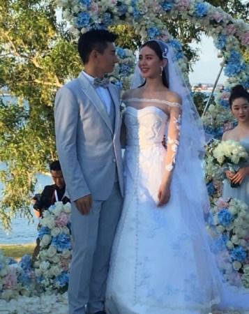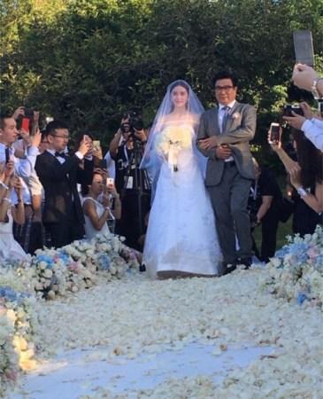 20日一早举行迎亲仪式,接着下午开始婚礼。一开始伴郎伴娘陆续出场,霍建华也帅气现身,最后吴奇隆出场,刘诗诗则由爸爸牵入充满花海的温馨会场。