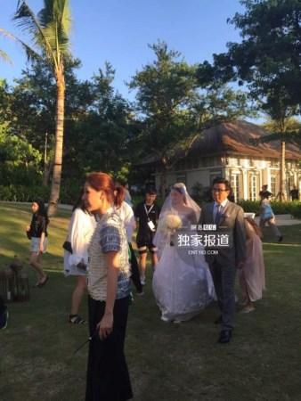 20日一早举行迎亲仪式,接着下午开始婚礼。一开始伴郎伴娘陆续出场,霍建华也帅气现身,最后吴奇隆出场,刘诗诗则由爸爸牵入充满花海的温馨会场。