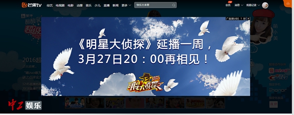 中工娱乐3月20日讯 3月20日,芒果TV在首页挂出了一张《明星大侦探》延迟播出的公告图,配文为《明星大侦探》延播一周,3月27日20:00再相见!这让原本满心欢喜前去观看《明星大侦探》的粉丝们扑了个空大呼好难过。