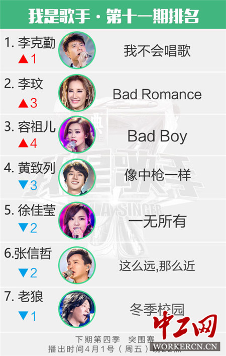 中工娱乐3月26日报道 25日晚,湖南卫视《我是歌手》第四轮终极淘汰赛尘埃落定,李克勤与郎朗再度跨界合作,凭《我不会唱歌》一举夺魁;李玟挑战Lady Gaga经典神曲摘得亚军之位;容祖儿火力大开带伤热舞冲进前三;而上一场排名靠后的老狼本周则因两期综合得票排名最末而遗憾出局。至此,本季突围赛人选随之浮出水面,李玟、李克勤、黄致列、徐佳莹四位首发歌手挺进总决赛,而包括张信哲、容祖儿、老狼、赵传、信、HAYA乐团、关喆、苏运莹、王晰、金志文在内的十组歌手将在下周角逐进入总决赛的最后三个名额。