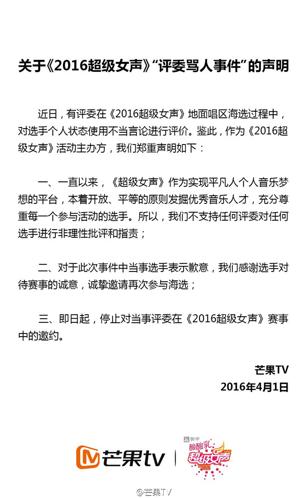 事件发生后,今日《2016超级女声》赛事主办方芒果TV迅速对外发布声明:1.表示不支持任何评委对任何选手进行非理性批评和指责;2.向当事选手致歉并邀请再次邀约参加海选;3.即刻停止该评委参与超级女声活动。声明发生后得到了国内各类媒体及网友的一致认可。