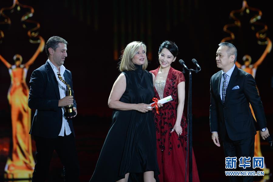 4月23日,颁奖嘉宾许晴(右二),陈德森(右一)为获得“天坛奖最佳女主角奖”的影片《帮派》颁奖。当日,在第六届北京国际电影节颁奖典礼上,“天坛奖”各奖项逐一揭晓。 新华社记者陈斌摄