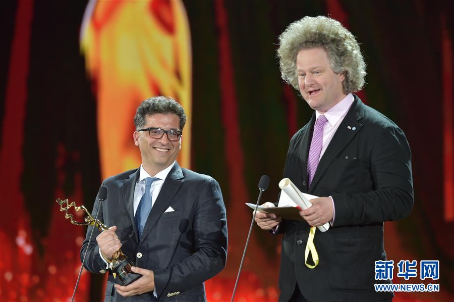 4月23日,丹尼斯·塔诺维奇(左),弗洛里安·亨克尔·冯·多纳斯马为天坛奖最佳男、女配角奖开奖。当日,在第六届北京国际电影节颁奖典礼上,“天坛奖”各奖项逐一揭晓。 新华社记者陈诚摄
