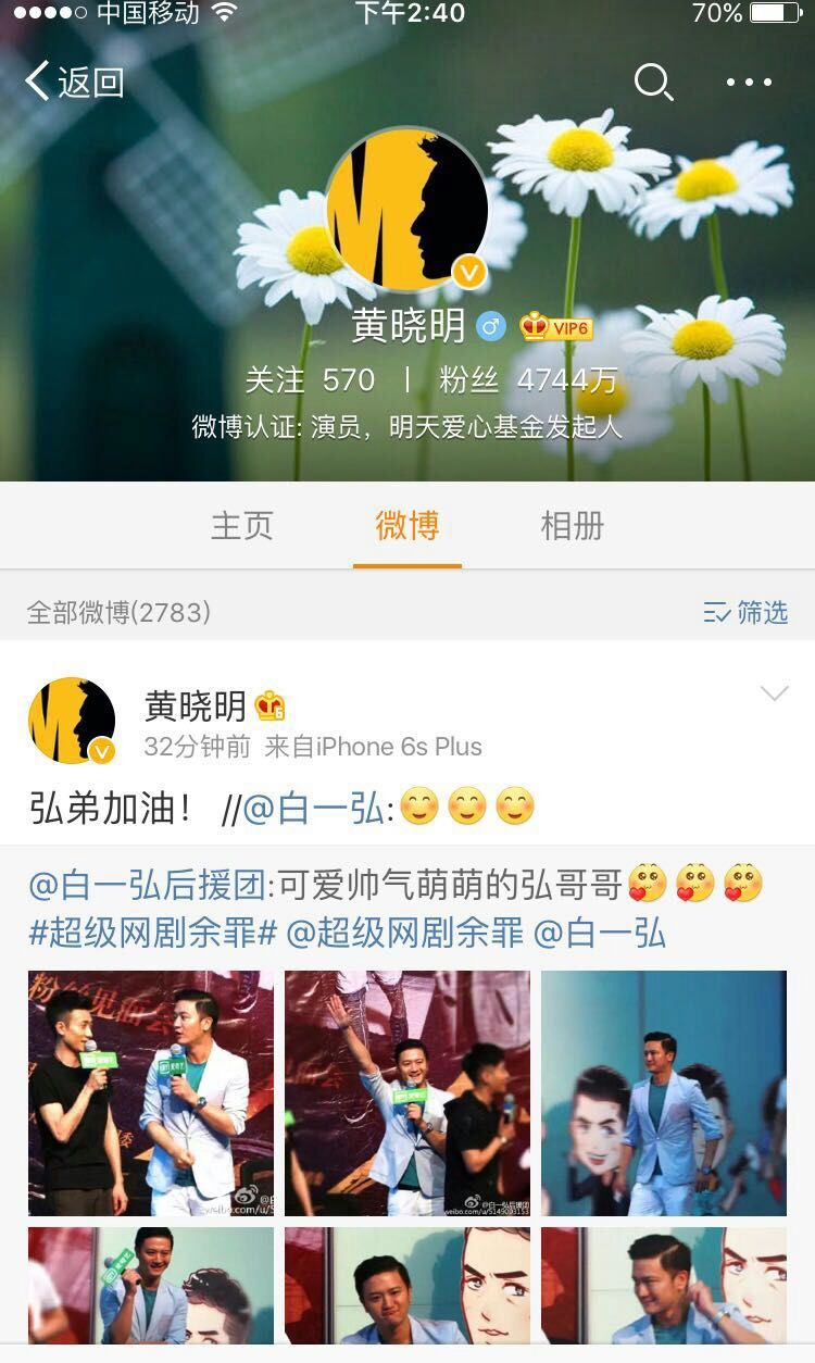 中工娱乐独家:黄晓明李冰冰不约而同转微博 为白一弘新戏加油!