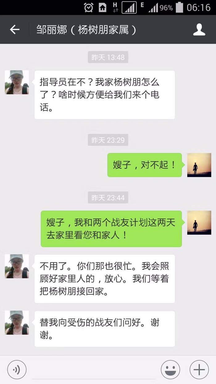 杨树朋的战友姜伟在微博中写道:“老杨。我的战友。我刚当班长那年,啥也不懂,是你手把手教我怎么当好一个班长。你的音容笑貌,我永远不会忘记。你的家人,我们会常去看望的,你放心。 一路走好……”