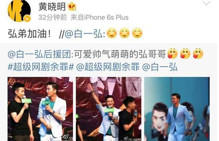 在《余罪》播出期间,黄晓明、李冰冰、佟丽娅等知名艺人纷纷发言力挺白一弘,如“弘弟加油”,“加油弘弟弟,加油汉奸”,“老同学的戏顶一下”等为其实力助阵。据悉,白一弘和佟丽娅是中央戏剧学院2004级表演系本科班的同班同学,白一弘拍摄的很多影视作品,佟丽娅都会助力支持,两人交情匪浅。而黄晓明和李冰冰也都是白一弘多年的好友,在白一弘的演艺生涯中,他们可谓是提携领路,鼎力相助。