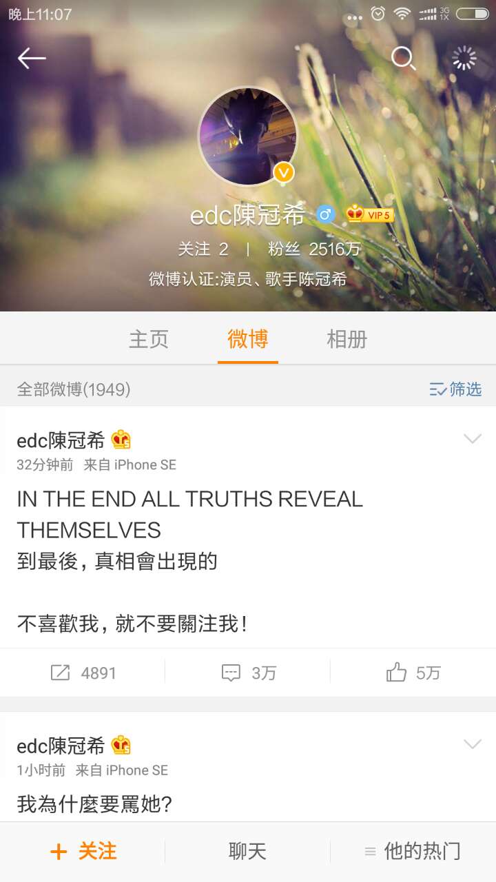 中工娱乐7月28日报道 7月27日晚21时许,前港星陈冠希发布带有侮辱性质的微博称某女星品行不端,并随文附台湾名模林志玲照片。在随后的一小时中,又连续发文称:“我为什么要骂她?她知道的,我早就警告她了。你们问一问她吧!你可以说我错,不过我觉得她比较错吧。”,“到最后,真相会出现的”。事件发生两小时后,陈冠希删除了原博。
