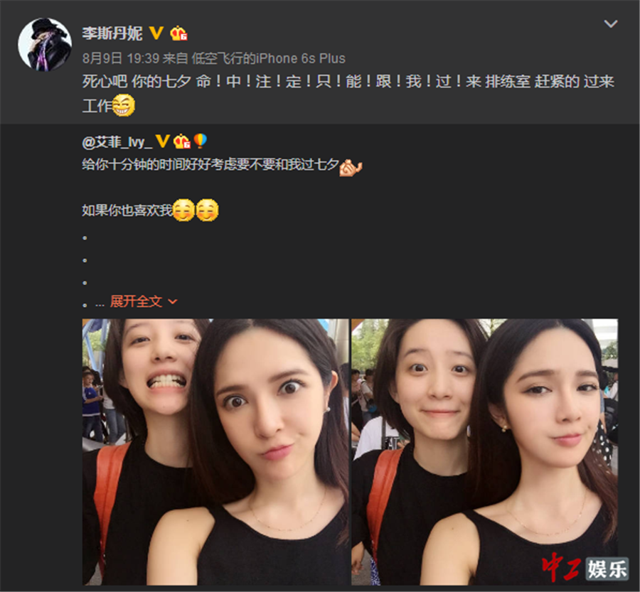两人微博的#王炸小剧场#话题,会时不时更新她们的相处视频,给对方化妆、互黑打趣等“恩爱日常”十分有爱。在七夕当天,李斯丹妮还呼唤艾菲共度佳节:“你的七夕命!中!注!定!只!能!跟!我!过!来排练室 赶紧的 过来工作”让网友直呼:“工作都说得这么有爱!命中注定,在一起吧!”而在新一期节目的录制现场,艾菲也大方“表白”李斯丹妮:“我觉得我和她的友情已经超越了组合的一个形式,我跟她平时生活中形影不离,我们俩的感情特别好!”这发自内心的“表白”也击中网友的心:“你们的狗粮我吃的香!”