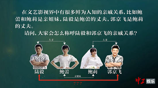 “在文艺影视界中有很多鲜为人知的亲戚关系,比如鲍蕾和鲍莉是亲姐妹,陆毅是鲍蕾的丈夫,郭京飞是鲍莉的丈夫,大家会如何呼陆毅和郭京飞的亲戚关系”,题目一出,外国选手们纷纷“大跌眼镜”。答题现场可谓“惨不忍睹”,选手们的答案简直比题目更“辣眼睛”,陆毅和郭京飞遭“躺枪”。五花八门的答案看得专家目瞪口呆,“宝宝不知道”、“吗吗”、“外兄”、“媳夫”纷纷出现,主持人则“暖心”安慰:“选手们的答案很可爱。”