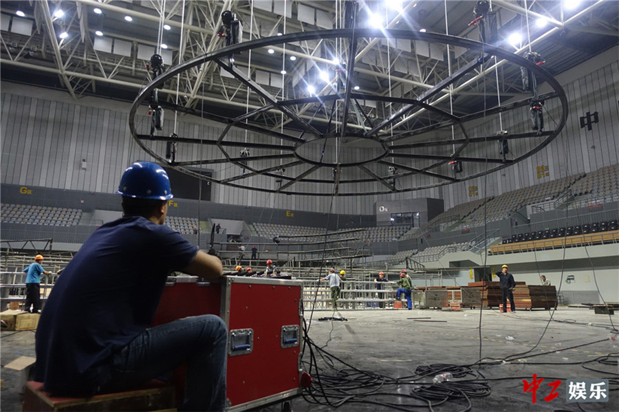 每一档棚内节目的录制,都从舞台的搭建开始。从无到有,直至完美。记者看到舞美设计图,第一感觉就是“惊艳”,外形看上去就像一个会发光的巨大“虫洞”。这次“声音的战争”的舞美设计整体力求“现代”、“科技”,外部结构借鉴大型机场的钢结构,形成了棚内舞美史上最大的一个穹顶结构,颇具未来感。“怎么样,是不是很震撼?”该节目的舞台统筹姜阳建的提问中带着一丝得意。“我们第一眼看到这设计稿的感觉跟你一样,但第二感觉么,就是太难实现了。”姜阳建介绍,整个棚面积超过了2400坪,超过了“中国好声音”及“我是歌手”等节目,是国内同类型节目中的第一。因为整个360度的全景舞台内部无支撑物,这给搭建增加非常大的难度,光是钢结构的重量就超过300吨。每根钢结构骨架的弧度都不一样,还要在整个钢结构上铺设视频条和LED屏,连接成了国内迄今最大的视频条装置,总长度超过了7000米。这些给舞台的施工搭建带来了巨大难度,甚至可以说是不可能的任务。这也直接导致项目招标时10几家执行公司看到方案后直接被吓到退出,更有公司代表坦言:“我们自己真心做不出来,但就是想来学习一下,看看有谁能把它们搭建起来。”