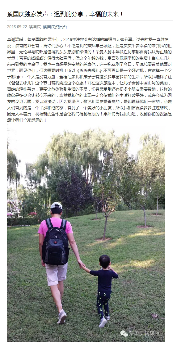 中工娱乐9月22日报道 今日(9月22日)凌晨,不老男神蔡国庆官方资讯平台发文“蔡国庆独家发声:迟到的分享,幸福的未来!”文中表示蔡国庆早已领证并育有一子,已带孩子参加《爸爸去哪儿4》。此外,蔡国庆还表示希望通过这个节目能让儿子面对世界,面对歌迷和网友,他相信祝福会多过非议。