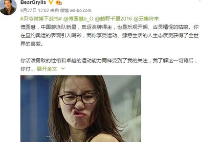 傅园慧以一句“洪荒之力”,瞬间成为奥运最受欢迎的选手之一,27日,她收到英国探险家、《荒野求生密技》的主持人贝尔所下战帖,邀请她参加探险真人秀。