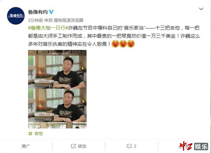 中工娱乐10月19日报道 近日,《鲁豫有约》官方微博发出一条许巍自曝“奢侈品身家”的微博,许巍作为全新访谈真人秀节目《鲁豫有约大咖一日行》的第八期嘉宾,在节目中回忆自己年轻时热爱音乐的经历,更是曝光了自己高达数万元的“音乐家当”吉他。此微博一出,迅速引发了众多许巍歌迷和网友的关注。