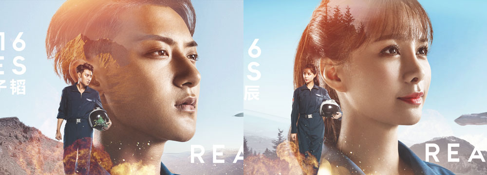 海报中,8位空军新兵脚下升腾起燃烧的火焰,头部特写上浮现出山川河流的影像,象征着中国军人将祖国深刻脑海,无论何时何地都心系祖国的爱国情怀和保家卫国的雄心壮志。