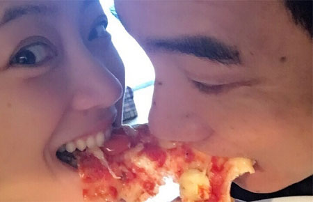 应采儿和陈小春同咬一块披萨 超甜蜜秀恩爱