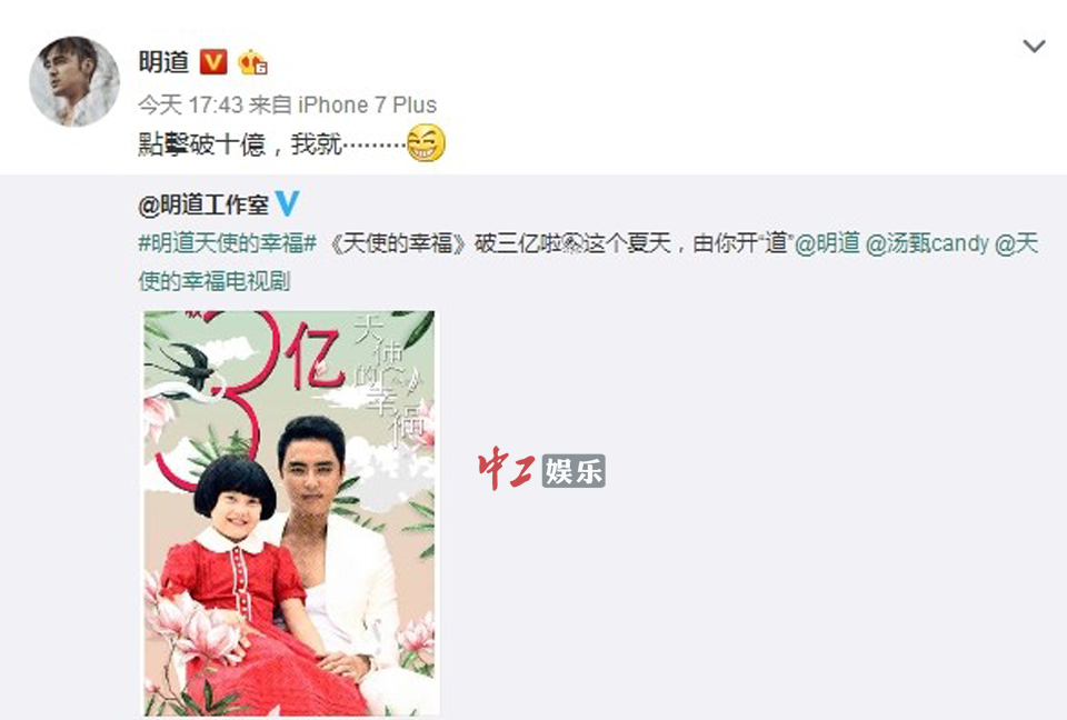 《天使的幸福》出品方明道工作室在微博发布喜报:“#明道天使的幸福# 《天使的幸福》破三亿啦🎊这个夏天,由你开“道”@明道@汤甄candy @天使的幸福电视剧”明道立马回复,“点击破十亿,我就……”并配上邪恶的表情包,看到明道这道开放式填空题,粉丝们不淡定了,纷纷留言表示“脱衣服”、“娶我”、“直播洗澡”,还有网友直言“破十亿就公布我们的恋情吗?”真是辣眼睛!