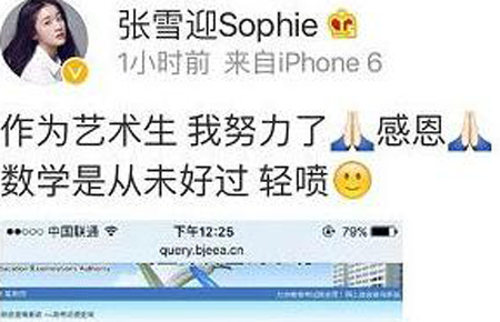 张雪迎晒高考成绩单 紧张压抑不忘自黑