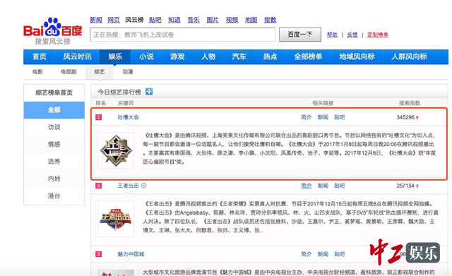 腾讯视频《吐槽大会》第二季自年末开播以来,话题讨论量持续攀升,“池子”、“音乐圈鄙视链”、“郎朗吐槽大会”、“冯潇霆吐槽大会”等话题都跻身微博热搜榜单,不仅打造出“有一种苦叫别人觉得你很苦”、“罗辑思维缺乏逻辑思维”、“做钢琴王子,不做钢琴胖子”、“你是国足吧”等社交金句,还在骨朵影视排行榜、百度风云榜等权威榜单霸榜刷屏,稳居第一。