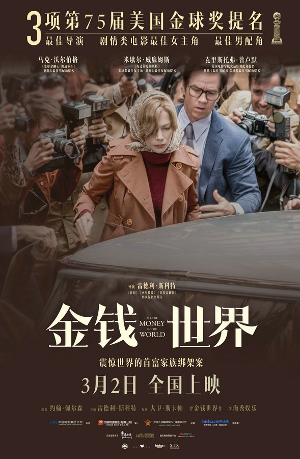 由雷德利·斯科特执导,马克·沃尔伯格、米歇尔·威廉姆斯、克里斯托弗·普卢默共同主演的电影《金钱世界》将于3月2日登陆全国院线。