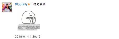 1月14日晚,林允通过微博回应近日素颜被拍上热搜,称:“林允素颜!”配上写有N多夸奖赞赏的词,“心疼的抱住聪明可爱机智善良勇敢无畏天生丽质霸气侧漏邪魅狂拽智商超群极具魅力温文尔雅风度翩翩彬彬有礼天下无双眉目清秀吹弹可破人面桃花英俊潇洒气宇不凡玉树临风仪表堂堂风流倜傥面如冠玉风度翩翩美目盼兮清新俊逸酷到爆的自己。”机智回应。