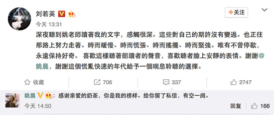 对于姚晨的这段朗读,刘若英本人也是赞叹不已,她还发微博表示:“深夜听到姚老师读著我的文字,感触很深。这些对自己的期许没有变过。也正往那路上努力走著。时而缓慢、时而慌张、时而摇摆、时而坚强。唯有不曾停歇,永远保持好奇。 喜欢这样听著朗读者的声音,喜欢听者脸上安静的表情。谢谢@姚晨,谢谢这个慌乱快速的年代给予一个喘息聆听的选择。“看到如此高度的评价,姚晨也给刘若英回复到:“感谢亲爱的奶茶,你是我的榜样。给你留了私信,有空一阅。“