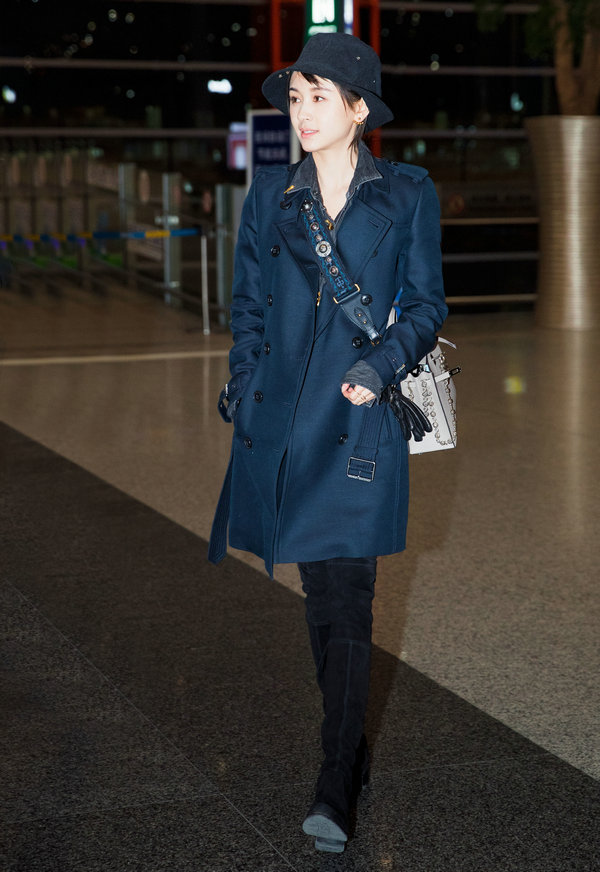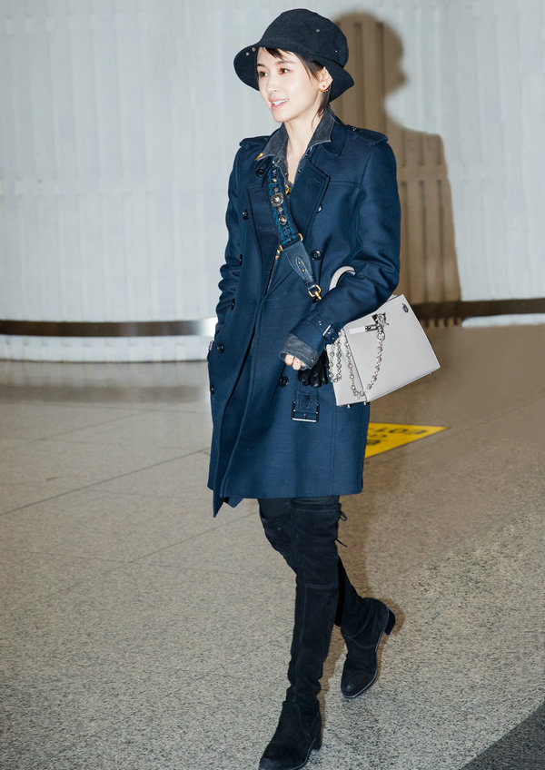 近日,王子文现身首都机场,以一身笔挺修身的深蓝色的牛仔大衣搭配黑色长靴,简单大方又不失知性优雅。双排金属扣为蓝色大衣起到了点睛的作用,黑色的宽檐帽更是让人眼前一亮,灰色的链条包与蓝色长外套相得益彰,保暖舒适的整套造型又被王子文演绎的别具新意。耳边个性扇形的耳圈装饰,多了几分小女人的精致。据悉此次王子文为赴新戏拍摄连日转场,却依然不惧疲惫在粉丝面前一脸明媚、笑容十足。