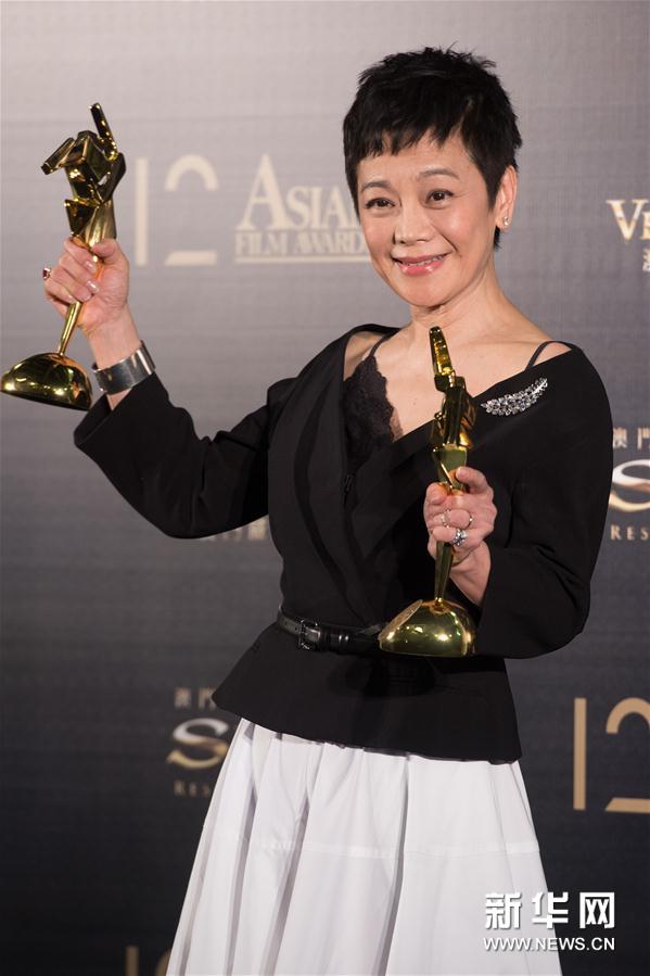 3月17日,张艾嘉在后台展示奖杯。 3月17日,第十二届亚洲电影大奖在澳门颁发,共颁出17个大奖。影片《芳华》夺得最佳电影,演员古天乐和张艾嘉分获最佳男、女主角。新华社记者 张金加 摄