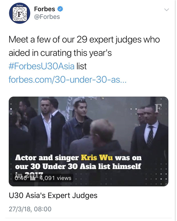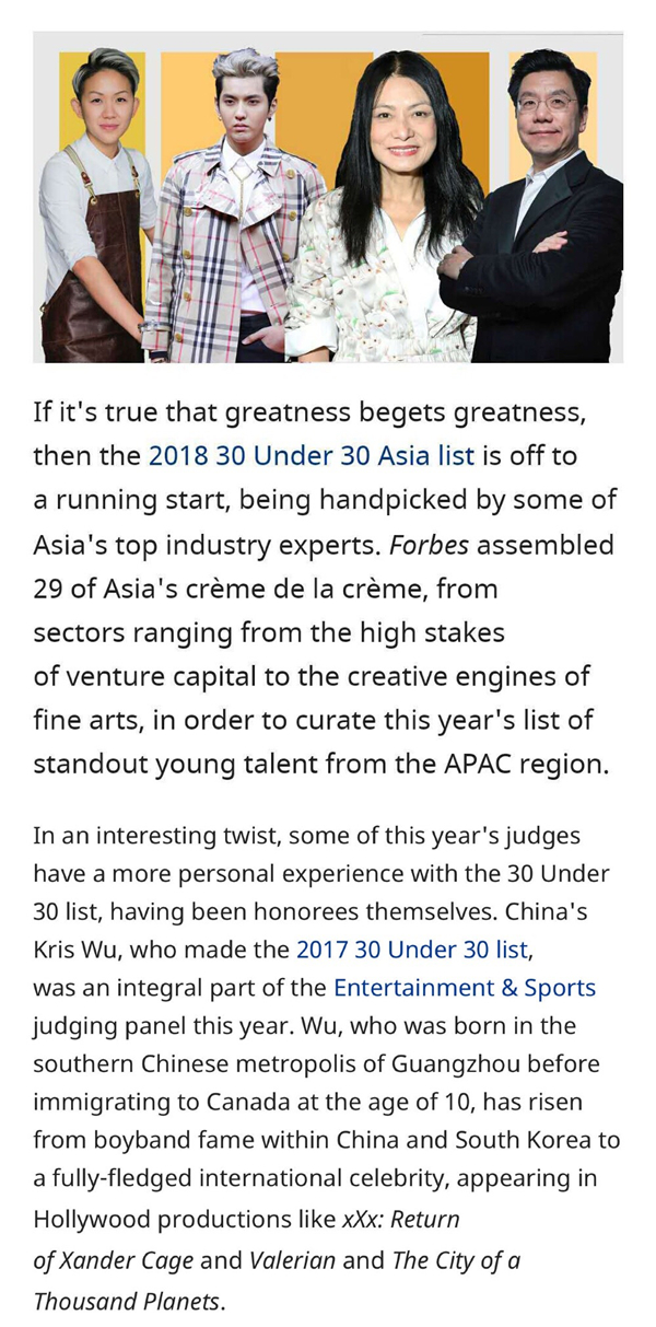 今日,美国福布斯(Forbes)在官方网站和官方推特上同时发布一则消息,宣布吴亦凡成为今年福布斯榜评委之一,参与评选亚洲地区30位30岁以下娱乐与体育杰出人物。
