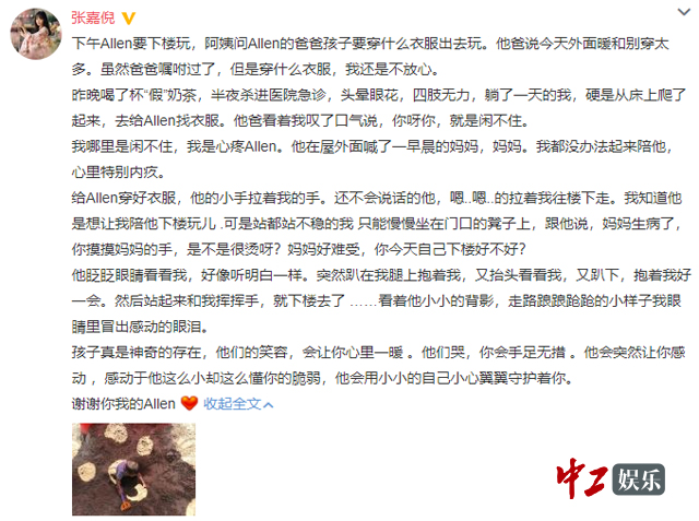 超感动!张嘉倪po长文记录萌娃生活 网友大赞:太温馨