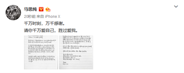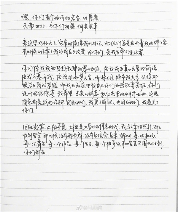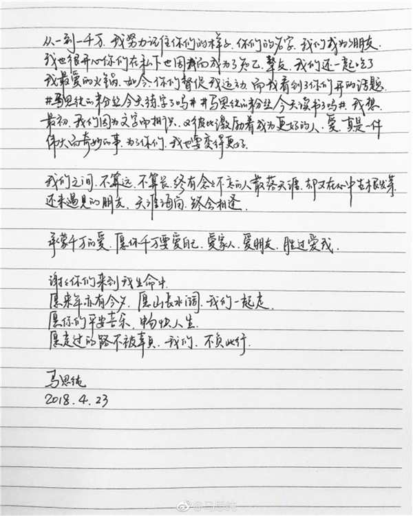 4月24日,马思纯微博粉丝突破千万之际,发布手写信感谢粉丝一路相伴。