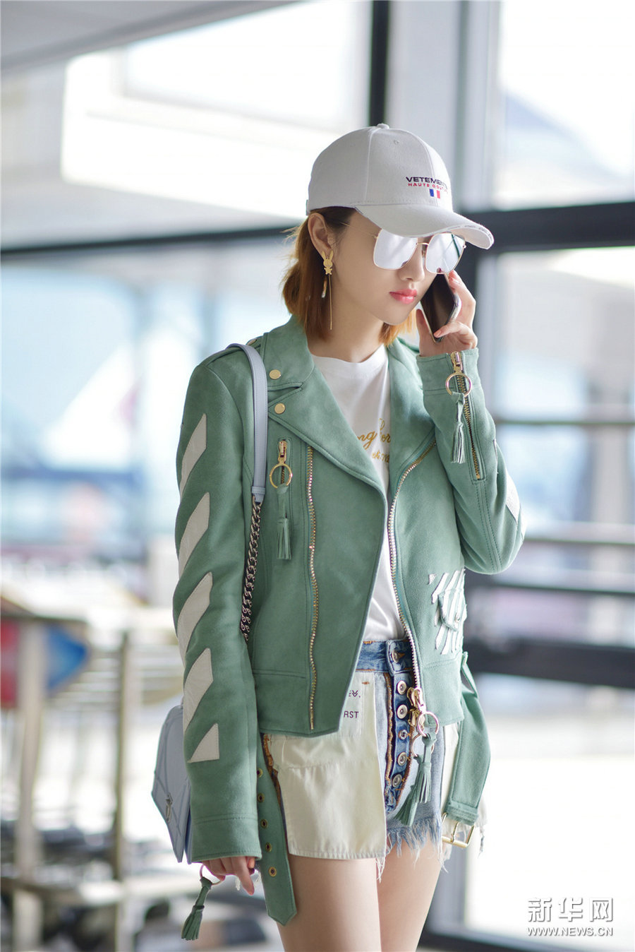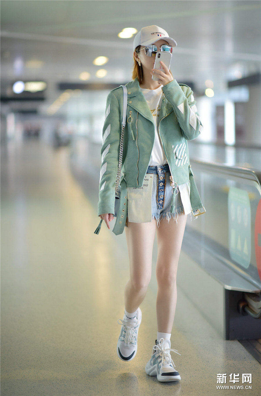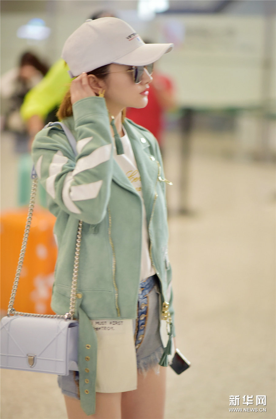 日前,景甜现身上海机场,身穿薄荷绿外套内搭白色T恤与浅蓝牛仔短裤,倍显清爽靓丽,长腿吸睛,超大太阳镜与白色鸭舌帽更显青春活力。